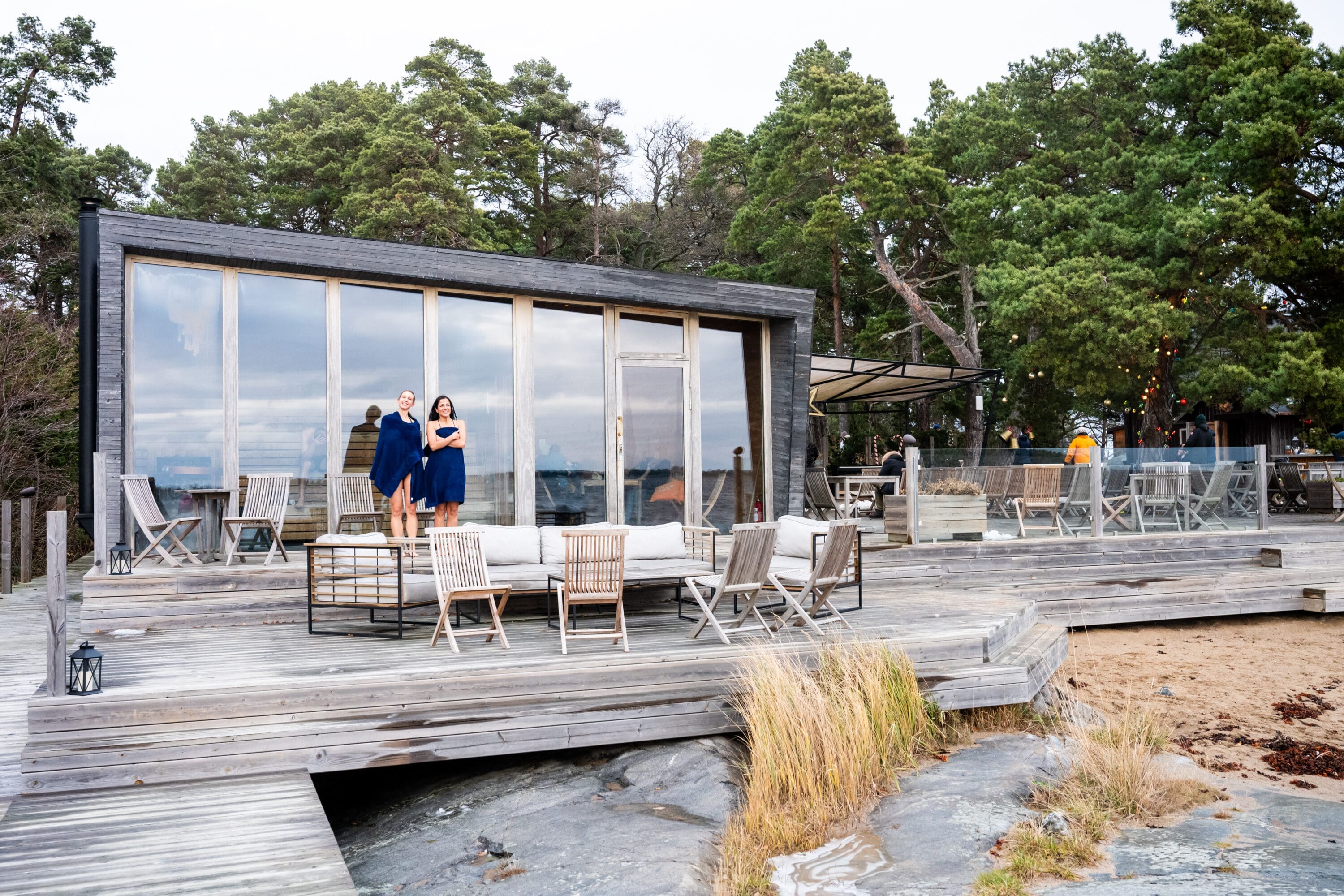 En handduk per person ingår och i anslutning till bastun finns dam- och herromklädningsrum med duschar & toalett.