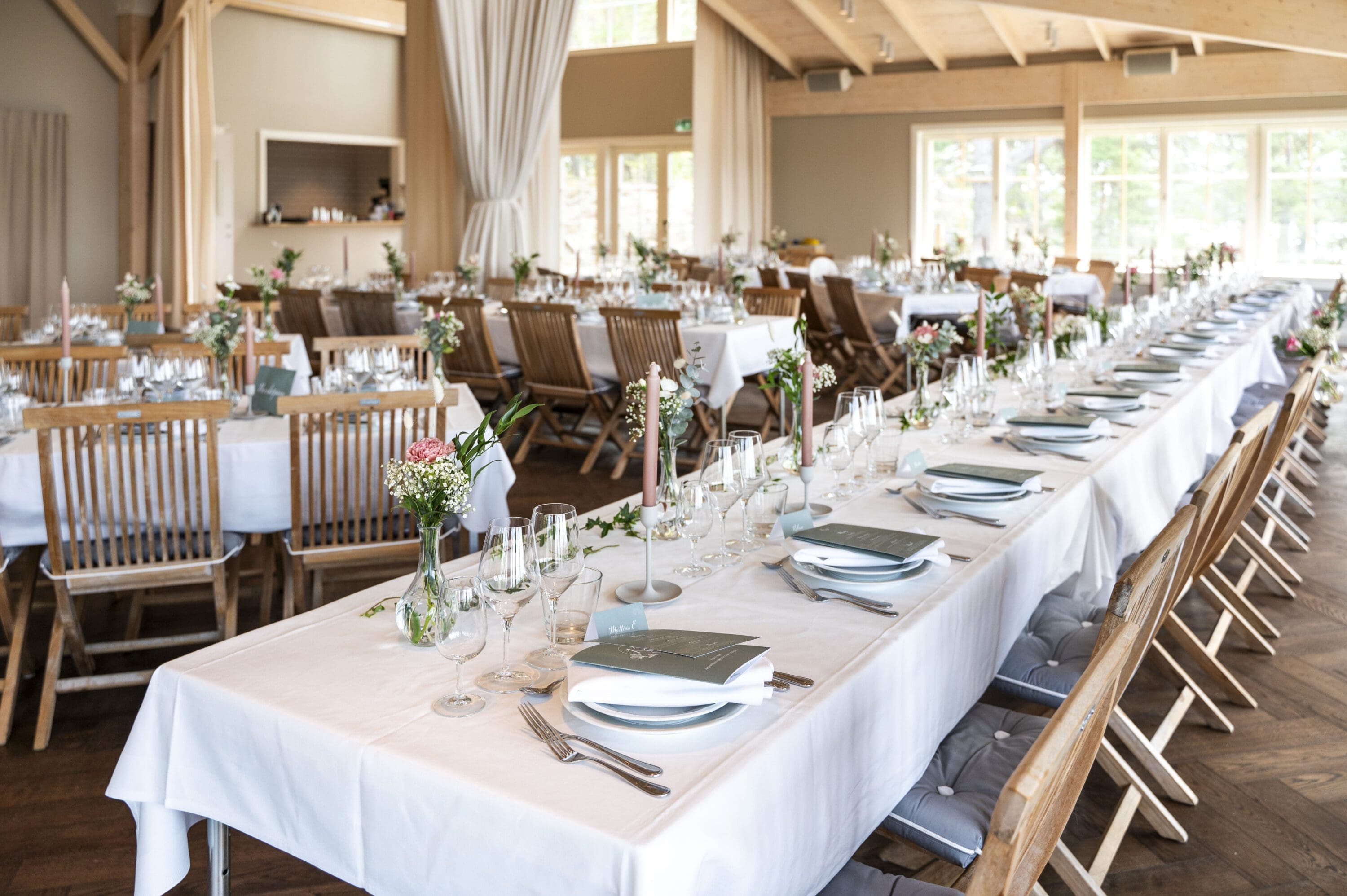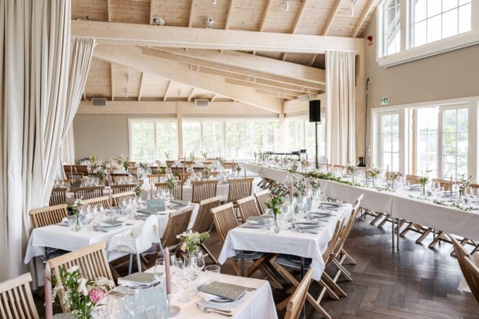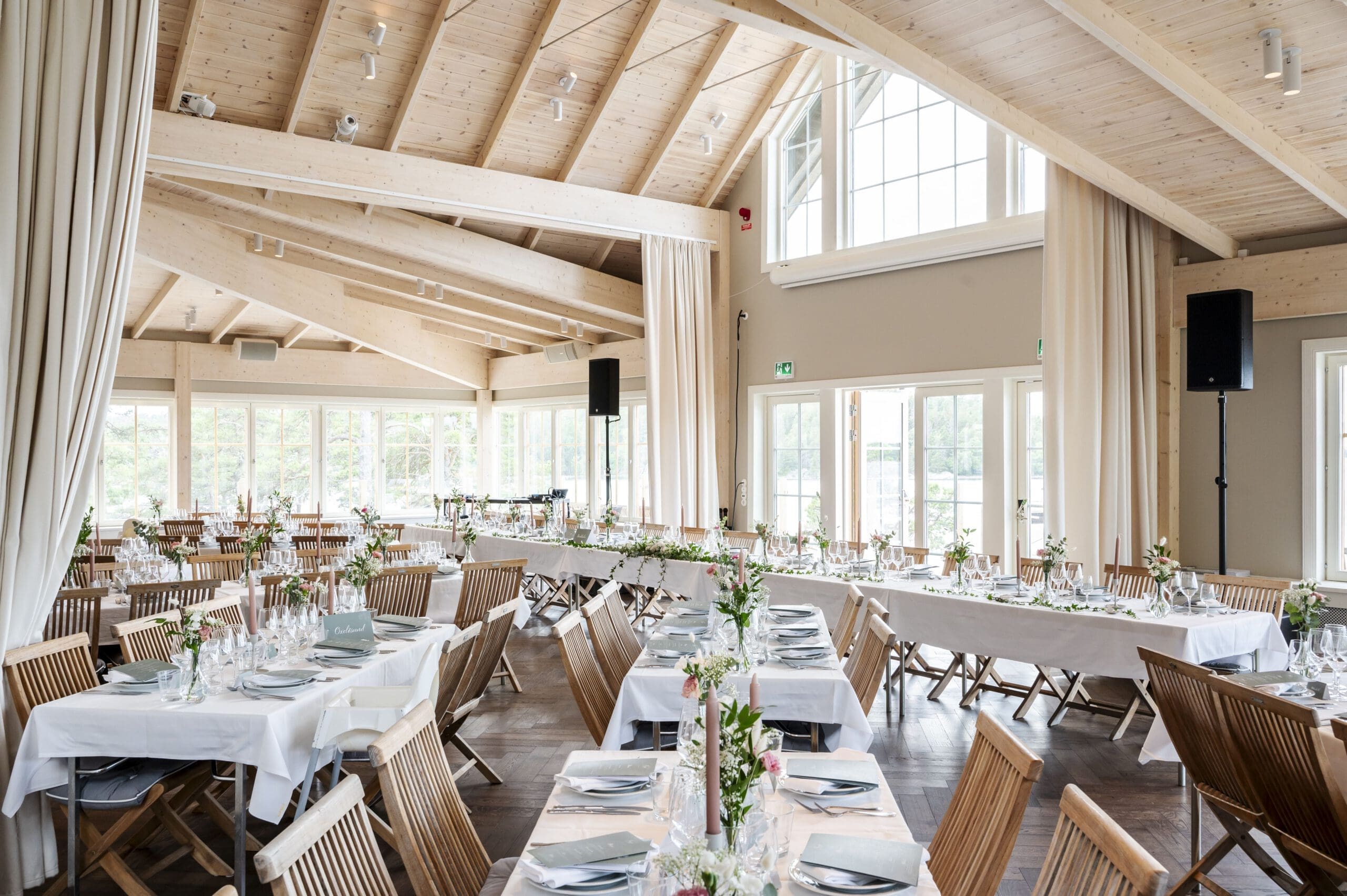 Festlokalen är skapad med bröllop och event i fokus och erbjuder generösa ytor för middag, dans och firande långt in på natten – med professionell ljud- och ljusteknik som ingår i upplägget.