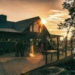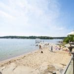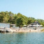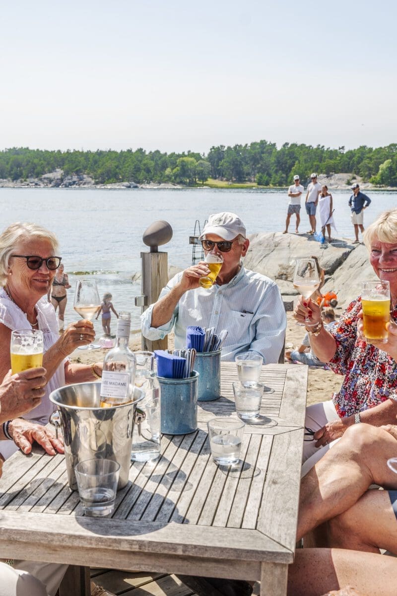 Med sin rustika matsal med braskamin i det gamla timmerhuset och sitt stora, öppna trädäck med underbar utsikt över fjärden erbjuder Strandbaren en härlig miljö för måltider och samkväm – oavsett väder, året om.