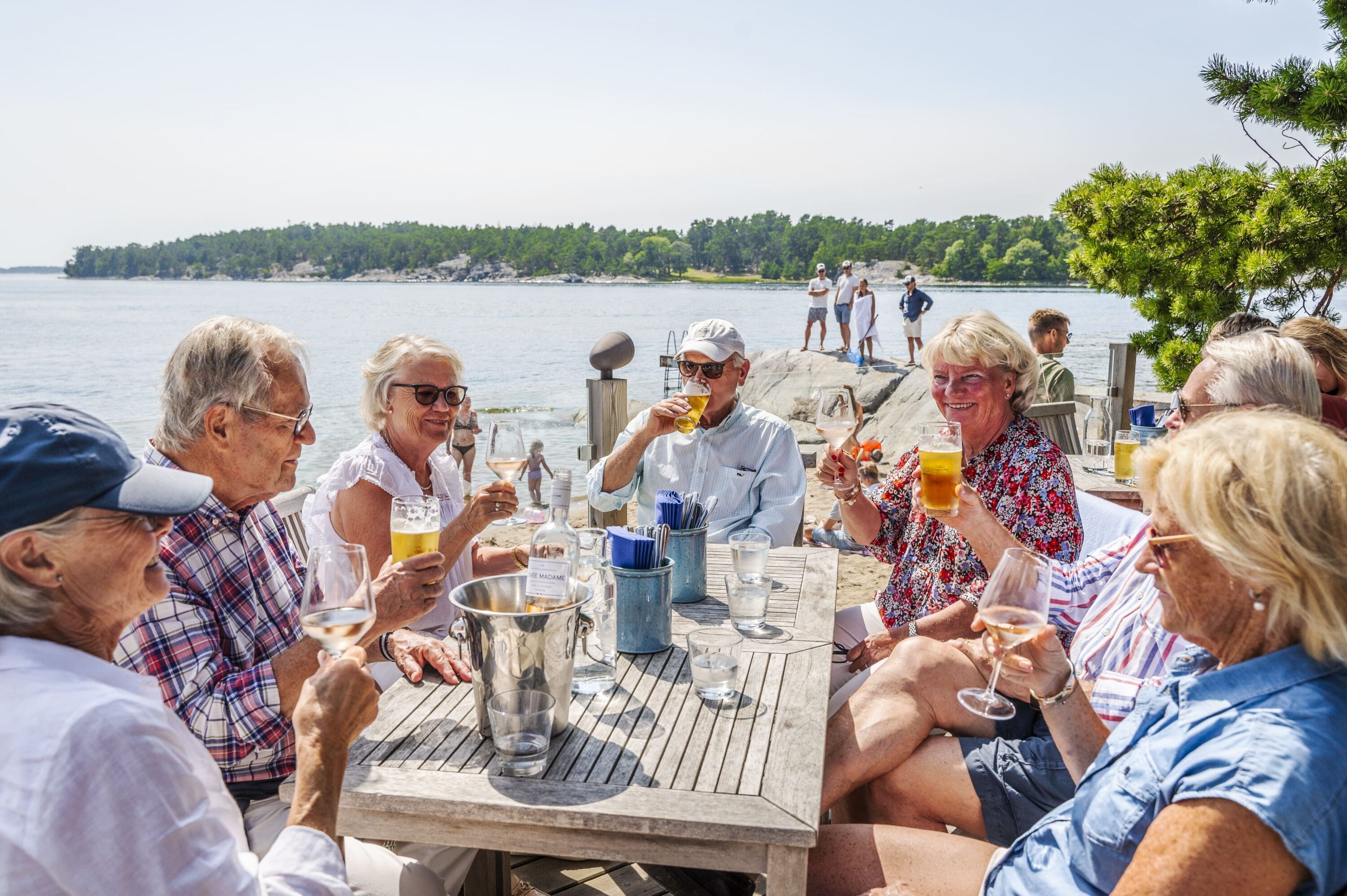 Precis intill Strandbaren finns sandstrand, badbrygga och en vedeldad bastu med panoramautsikt över havet. Här kan ni och era gäster koppla av inför den stora dagen och njuta av stillheten, vågornas brus och den vidsträckta utsikten över skärgården.