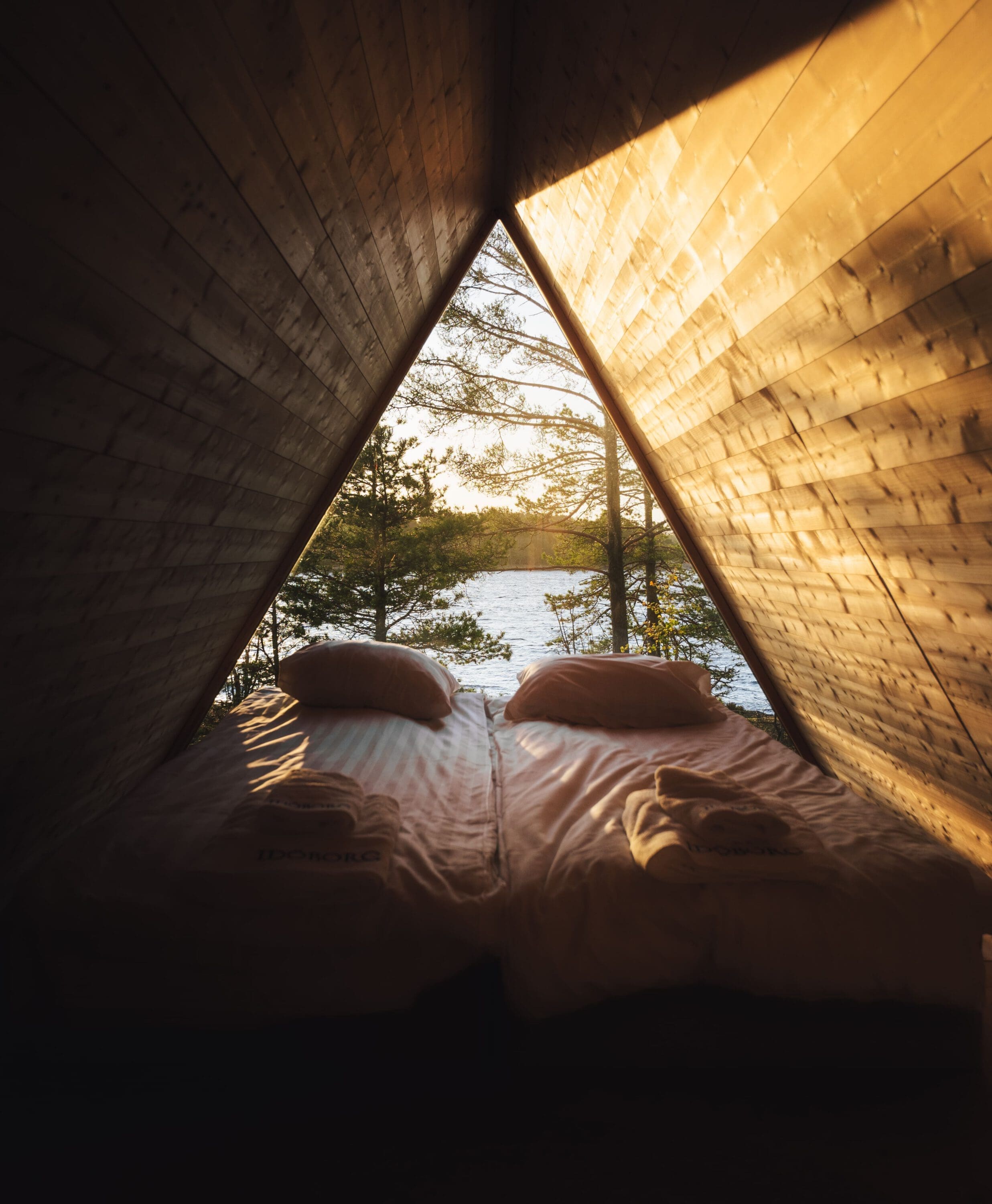 Efter en härlig kväll på Strandbaren med bastubad och trerättersmiddag väntar den varma stugan på er. Kryp ner i sängen och blicka ut över en skärgård i skymning.